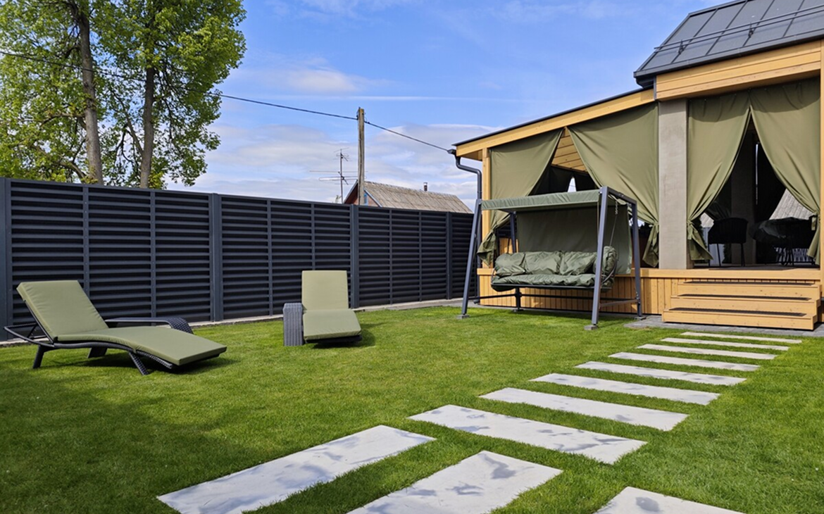 На территории вас ждёт большая зона барбекю с казаном, шампурами, решётками для гриля, дровами и всем необходимым для приготовления вкусных блюд. Для активного отдыха оборудованы батут, мини-баскетбольная площадка, садовые качели, шезлонги и крытая терраса с подвесными качелями и уютным столиком. Вечером территория подсвечивается ландшафтной подсветкой.