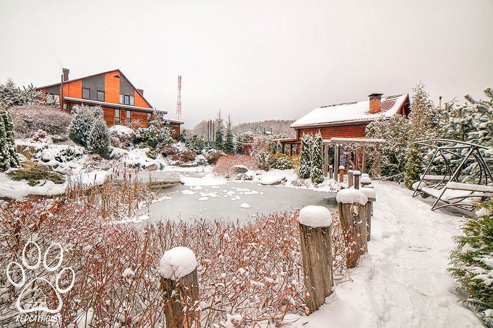 В деревянном доме 2 комнаты отдыха и 5 спален, где с комфортом могут разместиться до 14 человек. Есть камин и русская баня на дровах. Красный коттедж с диско-залом идеально подойдёт для большой компании до 16 человек (6 спален). Банкетный зал с мини-кофейней и открытой террасой рассчитан на 35 человек.